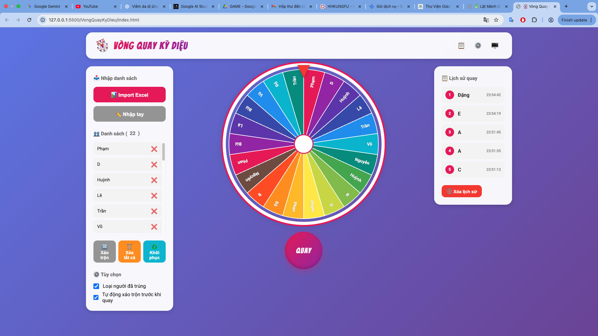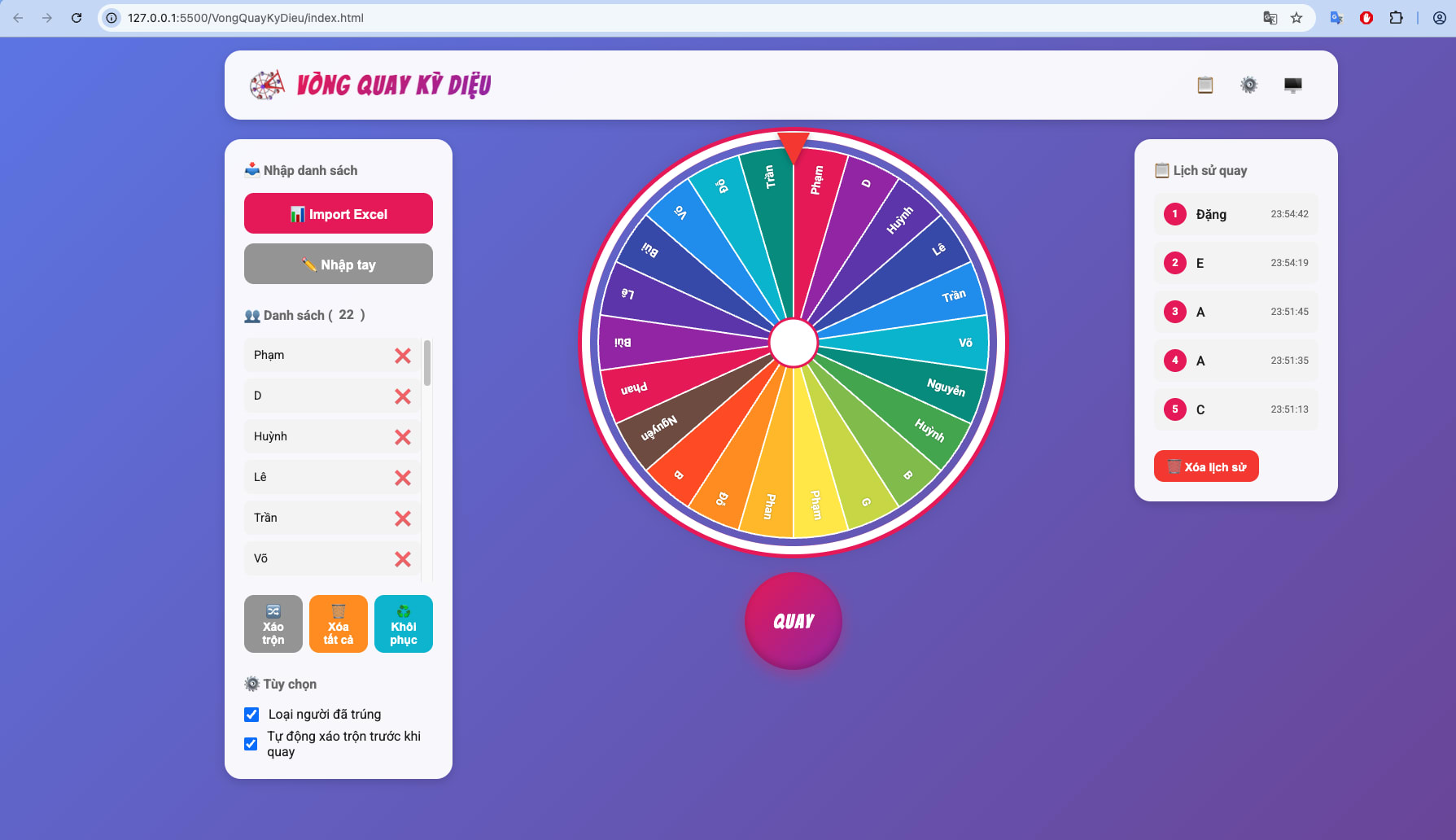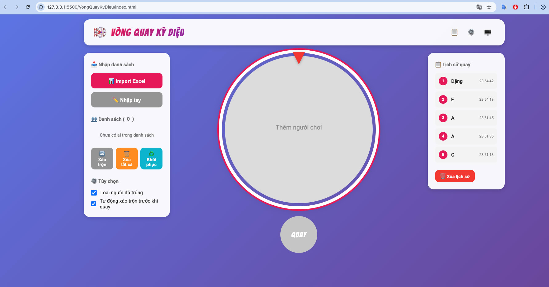 **Vòng Quay Kỳ Diệu** là trò chơi vòng quay may mắn (lucky wheel) để chọn người ngẫu nhiên, tạo không khí sôi động và công bằng cho lớp học hoặc sự kiện.